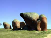 | Etwa 40 km südöstlich von Streaky Bay folgten wir der Ausschilderung am Flinders Highway zu "Murphy´s Haystacks". Dabei handelt es sich Inselberge aus über 1,5 Milliarden Jahre altem, rostrotem Granit. Die auf dem Gelände einer privaten Farm gelegenen "inselbergs", wie die Aussies die aus dem Deutschen übernommene Bezeichnung ins Englische übersetzt haben, sind gegen eine geringe Eintrittsgebühr (2 AUD pro Person) zugänglich. Zwei Gruppen dieser eigentümlichen Gebilde stehen völlig unvermittelt inmitten des frisch gemähten Weidelandes. | ![]() |